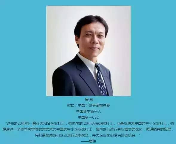 唐駿資本商學院 ,是以微軟(中國)終身榮譽總裁唐駿先生命名的,以國際一流資本商學院為目標辦學,旨在為中國中小企業(yè)家量身打造實現(xiàn)跨越的舞臺——“與資本為舞,與世界接軌”,中國商界新時代商學院!