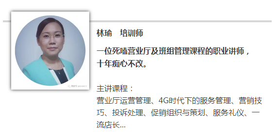 * 培訓(xùn)師林瑜客戶服務(wù)營(yíng)銷實(shí)戰(zhàn)派講師; * 16年專注于營(yíng)業(yè)廳一線、裝維一線、客服一線,專注服務(wù)提升、投訴處理、銷售技巧、廳店運(yùn)營(yíng)、基層班組長(zhǎng)課程,在這個(gè)領(lǐng)域里精耕細(xì)作,做專、做精,塑就市場(chǎng)與學(xué)員好口碑; * 累計(jì)為中國(guó)移動(dòng)、中國(guó)聯(lián)通、中國(guó)電信多個(gè)省、市公司提供培訓(xùn)超千場(chǎng), 累計(jì)參訓(xùn)人..