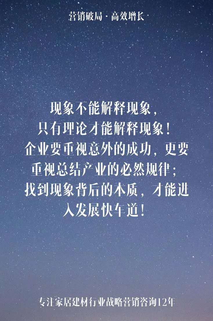 現(xiàn)象不能解釋現(xiàn)象,只有理論才能解釋現(xiàn)象!企業(yè)要重視意外的成功,更要重視總結(jié)產(chǎn)業(yè)的必然規(guī)律;找到現(xiàn)象背后的本質(zhì),才能進入發(fā)展快車道! |