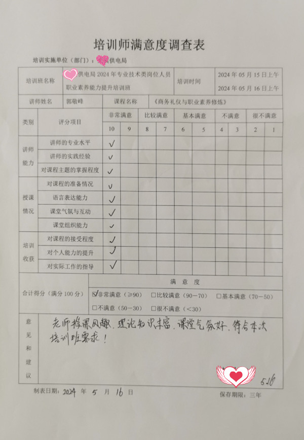 返聘!2024年5月16日,中國南方電網(wǎng)《職業(yè)素養(yǎng)修煉與商務(wù)禮儀》第二期課程完美收官!“壓力績效管理專家”郭敬峰老師再次受邀分享,伴隨著熱烈的團體PK活動,大家積極投入體驗式培訓(xùn),激發(fā)內(nèi)在學(xué)習(xí)動機,感受快樂學(xué)習(xí)氛圍,在工作中找到更多勝任感和成就感“職業(yè)高峰體驗”,課后《培訓(xùn)師滿意度調(diào)查表》滿分100! ![]() 針對基層班組長和專業(yè)技術(shù)人員的綜合能力提升培訓(xùn)班包含:“職業(yè)素養(yǎng)修煉、日常職場禮儀、商務(wù)接待禮儀”等,內(nèi)容落地,生動有趣,氛圍熱烈,以下為精彩花絮。