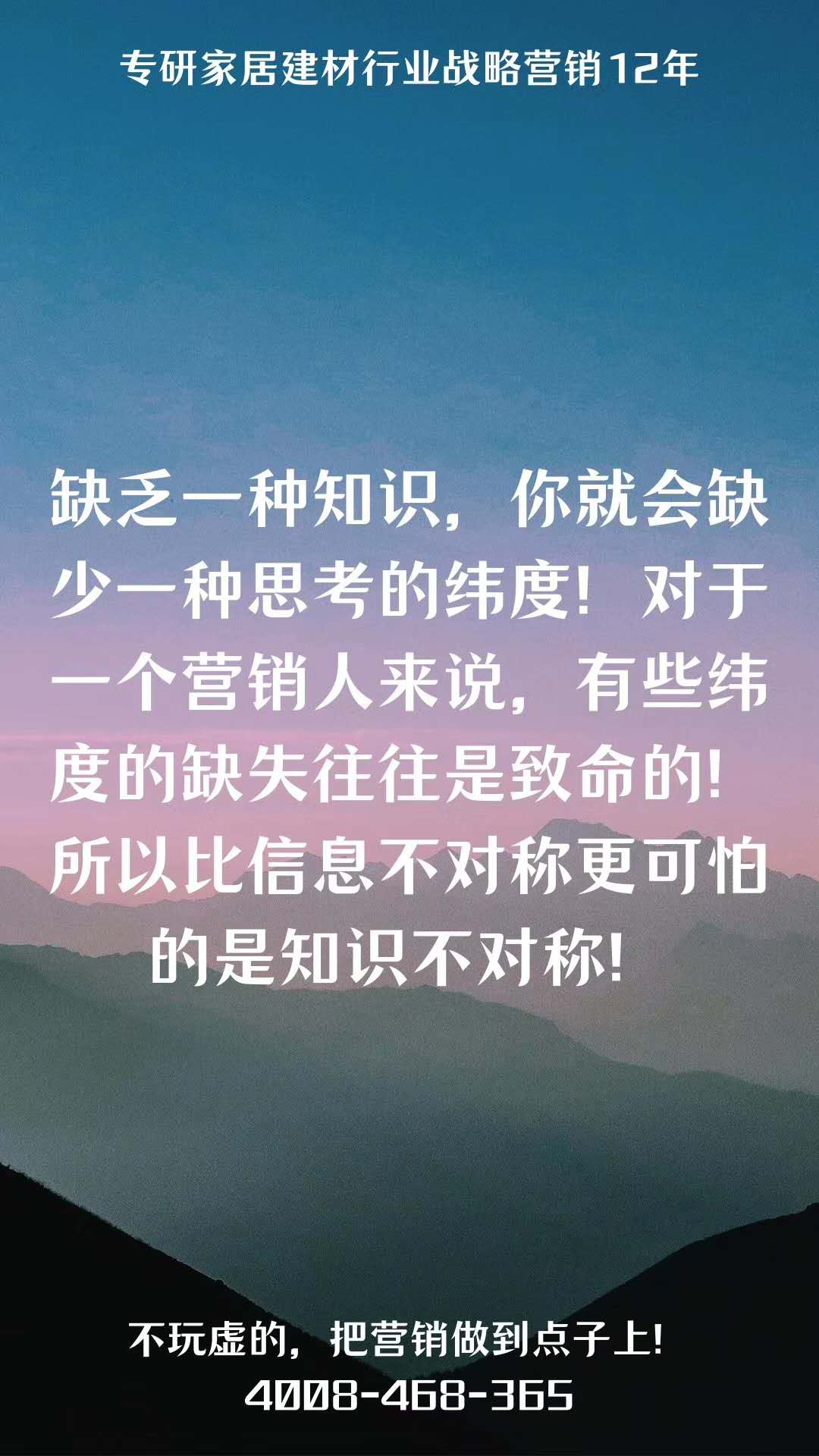 劉登榜 專注家居建材行業(yè)戰(zhàn)略營(yíng)銷咨詢12年 北京和君智業(yè)教育科技有限公司總經(jīng)理 中國(guó)家居建材行業(yè)戰(zhàn)略營(yíng)銷研究中心發(fā)起人 大商公司化運(yùn)營(yíng)專業(yè)顧問 資深實(shí)戰(zhàn)派講師 戰(zhàn)略營(yíng)銷語(yǔ)錄:信息無(wú)效! 缺乏一種知識(shí),你就會(huì)缺少一種思考的緯度! 對(duì)于一個(gè)營(yíng)銷人來(lái)說(shuō),有些緯度的缺失往往是致命的! 所以比信息不對(duì)稱更可怕的是知識(shí)不對(duì)稱! ![]() 【怕停滯,找登榜,戰(zhàn)略營(yíng)銷助增長(zhǎng)!】 |