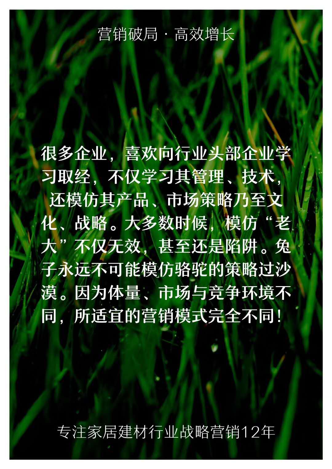 劉登榜 專注家居建材行業(yè)戰(zhàn)略營(yíng)銷咨詢12年 北京和君智業(yè)教育科技有限公司總經(jīng)理 中國(guó)家居建材行業(yè)戰(zhàn)略營(yíng)銷研究中心發(fā)起人 大商公司化運(yùn)營(yíng)專業(yè)顧問 資深實(shí)戰(zhàn)派講師 戰(zhàn)略營(yíng)銷語錄:走投無路! 很多企業(yè),喜歡向行業(yè)頭部企業(yè)學(xué)習(xí)取經(jīng),不僅學(xué)習(xí)其管理、技術(shù),還模仿其產(chǎn)品、市場(chǎng)策略乃至文化、戰(zhàn)略。大多數(shù)時(shí)候,模仿“老大”不僅無效,甚至還是陷阱。兔子永遠(yuǎn)不可能模仿駱駝的策略過沙漠。因?yàn)轶w量、市場(chǎng)與競(jìng)爭(zhēng)環(huán)境不同,所適宜的營(yíng)銷模式完全不同!
