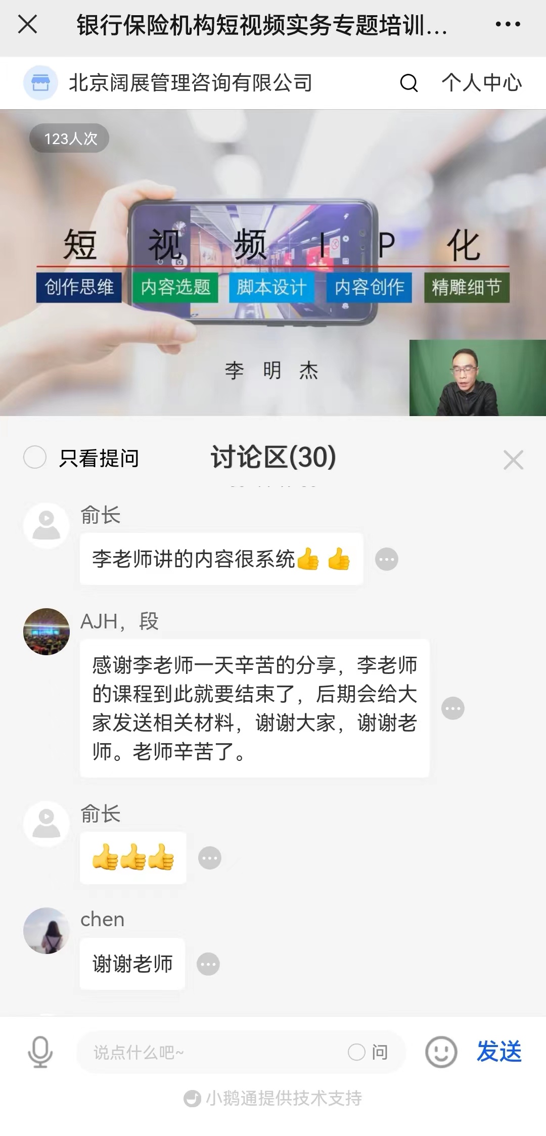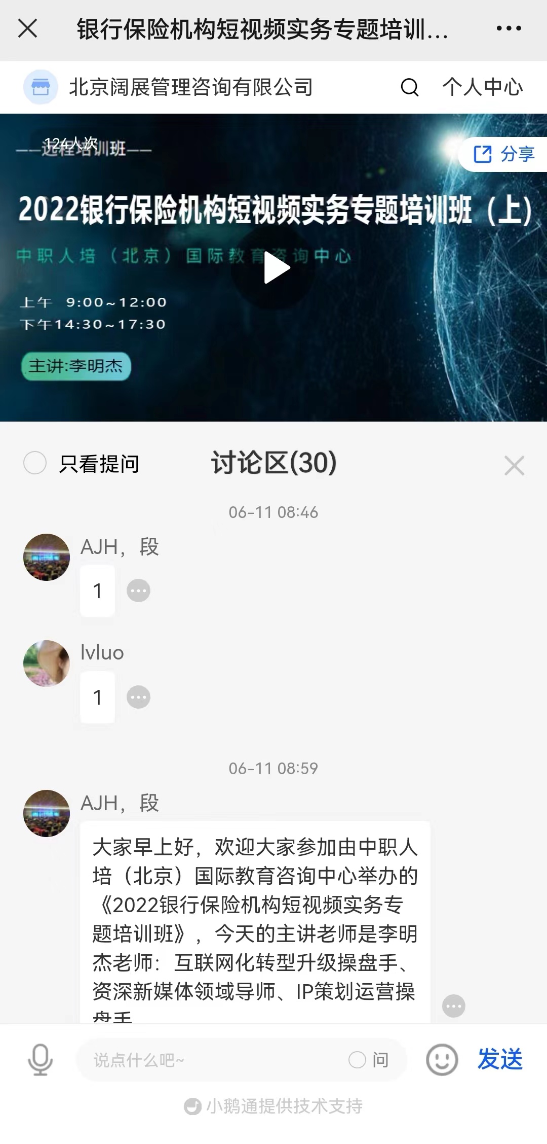 6月11日,《2022銀行保險(xiǎn)機(jī)構(gòu)短視頻實(shí)務(wù)專題培訓(xùn)班》邀請(qǐng)李明杰老師通過線上直播形式講授《短視頻運(yùn)營(yíng)策略與技巧》課程。