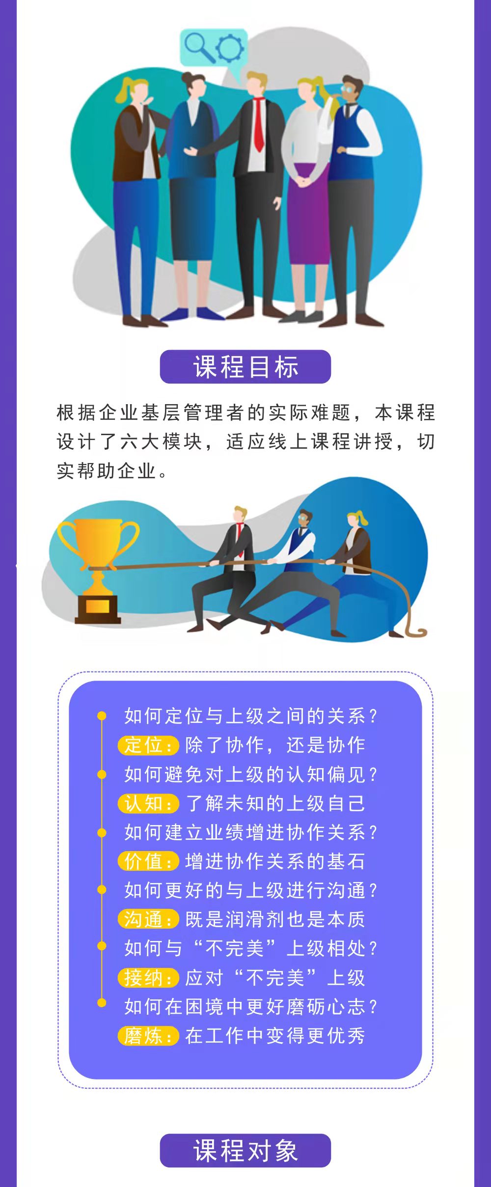 根據(jù)企業(yè)基層管理者的實際難題,本課程設(shè)計了六大模塊,適應(yīng)線上課程講授,切實幫助企業(yè)。