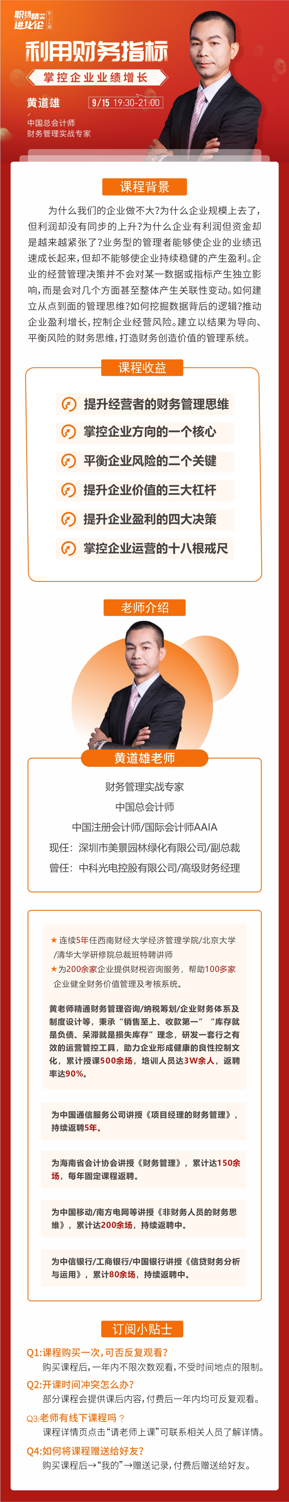 黃老師精通財(cái)務(wù)管理咨詢/納稅籌劃/企業(yè)財(cái)務(wù)體系及制度設(shè)計(jì)等,秉承“銷售至上、收款第一”“庫(kù)存就是負(fù)債、呆滯就是損失庫(kù)存”理念,研發(fā)一套行之有效的運(yùn)營(yíng)管控工具,助力企業(yè)形成健康的良性控制文化,累計(jì)授課500余場(chǎng),培訓(xùn)人員達(dá)3W余人,返聘率達(dá)90%。