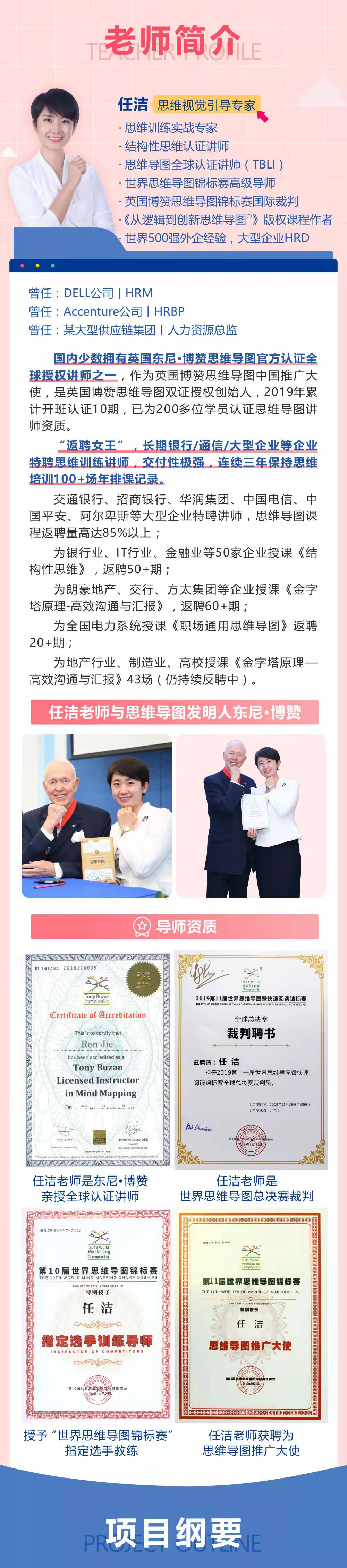 國內(nèi)少數(shù)擁有英國東尼·博贊思維導(dǎo)圖官方認證全球授權(quán)講師之一,作為英國博贊思維導(dǎo)圖中國推廣大使,是英國博贊思維導(dǎo)圖雙證授權(quán)創(chuàng)始人,2019年累計開班認證10期,已為200多位學(xué)員認證思維導(dǎo)圖講師資質(zhì)。