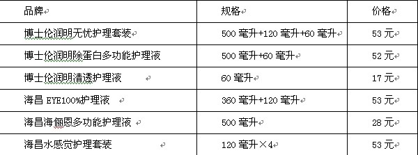 ①護(hù)理液:博士倫潤(rùn)明無(wú)憂護(hù)理套裝、博士倫潤(rùn)明除蛋白多功能護(hù)理液、博士倫潤(rùn)明清透護(hù)理液、海昌EYE100%護(hù)理液、海昌海儷恩多功能護(hù)理液、海昌水感覺(jué)護(hù)理套裝