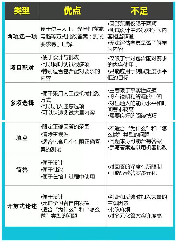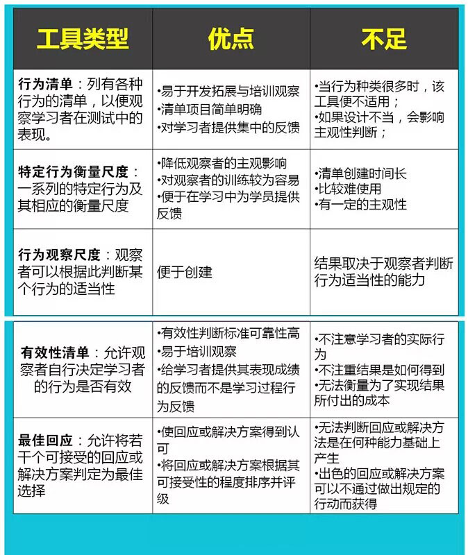 根據(jù)柯克帕特理克(Kirkpatrick)提出的培訓(xùn)模式中的第三層業(yè)績考核法來進(jìn)行評估,判斷工具的清單,包括其種類、優(yōu)點(diǎn)和不足,根據(jù)實(shí)際情況選擇一種來使用。