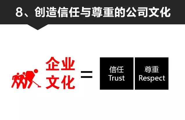 企業(yè)文化在一個(gè)公司的重要性不言而喻,這種文化首先表現(xiàn)為尊重個(gè)人的尊嚴(yán)和價(jià)值,以及對(duì)員工的充分信任,大多數(shù)的公司很少采用命令式的管理,更多的是采用目標(biāo)管理法,給予員工更大的工作自由程度。
