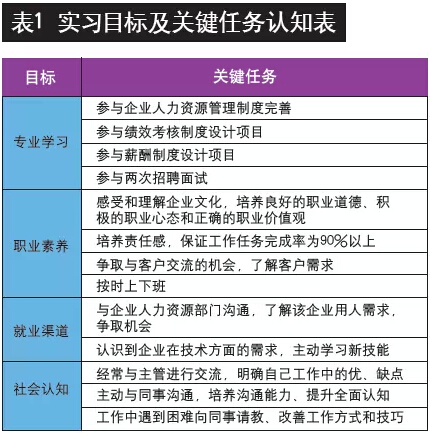 學(xué)校實習(xí)指導(dǎo)培訓(xùn)的第一步是讓大學(xué)生充分認識到實習(xí)的重要性和作用,并號召其根據(jù)個人的就業(yè)意向,挖掘自己實習(xí)的真正目的和任務(wù)。具體形式可通過開展“我的實習(xí)、我的目標(biāo)、我的未來”的主題教育講座,并在講座后要求每個學(xué)生填寫《實習(xí)目標(biāo)及關(guān)鍵任務(wù)認知表》(參見表1)。每個學(xué)生的實習(xí)目標(biāo)最多5個,每個目標(biāo)最多包含4個關(guān)鍵任務(wù)。目標(biāo)必須是確切的,要有一定的難度和挑戰(zhàn)性。