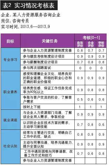 學(xué)生依據(jù)自己的目標(biāo)任務(wù)以及企業(yè)的要求,在實習(xí)過程中不斷接受現(xiàn)實工作的培訓(xùn),在實踐中成長。在實習(xí)結(jié)束后進行實習(xí)考核。考核可按照《實習(xí)情況考核表》(如表2)進行,內(nèi)容包括個人評價、企業(yè)評價及學(xué)校評價。學(xué)生個人、主管領(lǐng)導(dǎo)和學(xué)校老師在0-1分之間對每一個關(guān)鍵性任務(wù)打分,1和0分別表示完全完成和完全沒有進展。但滿分1分并不意味著成功,反而說明目標(biāo)不具有挑戰(zhàn)性;目標(biāo)評價值≤0.4分也不意味著失敗,而應(yīng)考慮目標(biāo)是不是應(yīng)該繼續(xù)進行,明確該做什么及不該做什么。最后,學(xué)生根據(jù)這份考核表進行總結(jié),形成實習(xí)報告,并與指導(dǎo)老師進行溝通,回顧反思這次實習(xí)經(jīng)歷,挖掘?qū)嵙?xí)的價值。