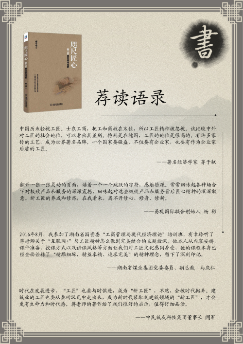 值得一提的是,蔣老師著述此書的過(guò)程,也恰恰詮釋了“新工匠”本身。“精華在筆端,咫尺匠心難。”相信你會(huì)在這本書里得到自己的收獲。