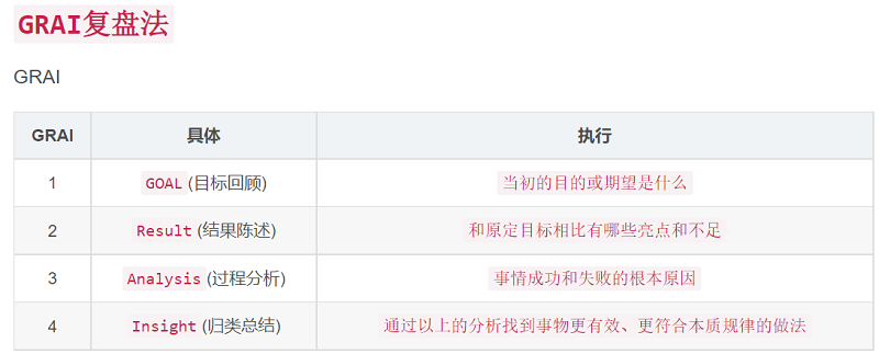 即Goal(目標回顧)、Result(結果陳述)、Analysis(過程分析)、Insight(歸類總結),