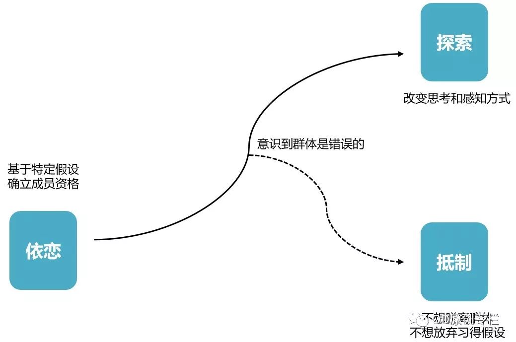 第二條路徑——抵制之路:從對(duì)舊知的依戀模式走向?qū)π轮奶剿?。如果群體意識(shí)到過往的思考模式是錯(cuò)誤的,就會(huì)促發(fā)群體改變思考和感知世界的方式。